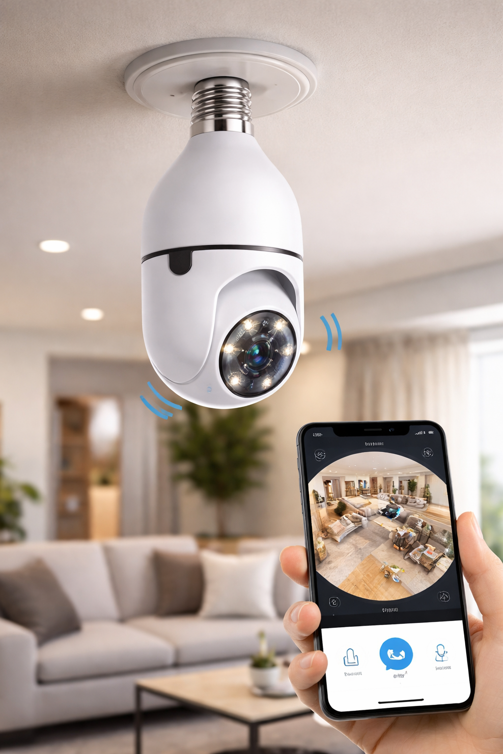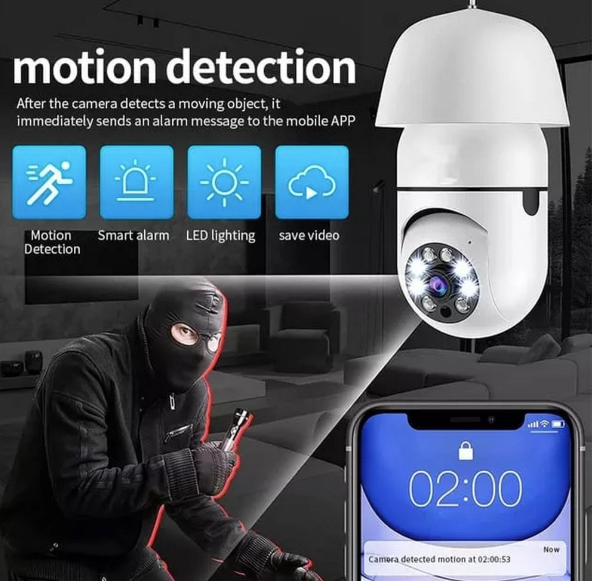 Convierte cualquier bombillo en una cámara de seguridad 360° con visión total y discreta.Graba en alta definición, detecta movimiento, envía alertas en tiempo real y se controla desde tu celular vía WiFi.Nadie notará que es una cámara. Ideal para casa, oficina o negocio, con audio bidireccional y visión nocturna.