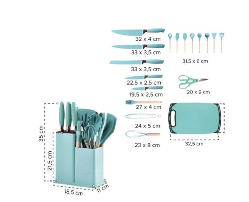 Este set de 19 utensilios es la solución perfecta para renovar tu espacio.Incluye todas las herramientas esenciales: cucharones, espátulas, batidor, pinzas, brocha, cuchara ranurada, espátula para pasteles y más. Fabricados en materiales resistentes y suaves para no rayar tus ollas.Diseño moderno, mangos ergonómicos y colores que combinan con cualquier estilo de cocina. Perfecto para uso diario, principiantes, chefs en casa o como regalo.
